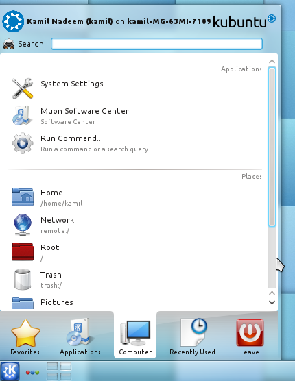 1) The K on the panel is the Kickoff application launcher.Click on it and you are greeted with "Favourites" Tab. The applications that you use the most can be quickly accessed from here, sort them alphabetically or just arrange them to your preference like I did by dragging them up and down.