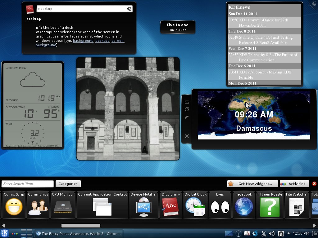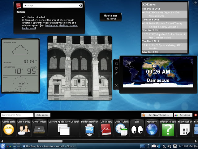 Consider the following example: A student needs certain widgets for his college work but not always. So he creates a "New Activity" with the widgets he needs and switches to it when he needs them. Makes sense right. The widgets running in the screenshot below are:Eyes, Folder View, Timer, Trashcan, Notes, Comic Strip with the xkcd comic(plenty comics available in the likes of Dilbert,Garfield,Snoopy and more). Kcalc is your calculator and it's not just any calculator. The wallpaper used in the screenshot below is courtesy Georgi Karavasilev. The shortcut for switching between Activities is "Meta+Tab".